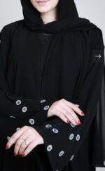 عباية صممت من اقماش فيرلي ليدي الاسود مع فصوص من الكريستال الامعة بشكل دائري متناسق مع اطراف الطرحة من الامامية