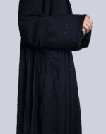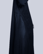 عباية اسود ب قماش الندى الناعم مع كسرات جانبية شيفون وشغل يدوي من الخرز الياباني باللون الاسود عل الجنب وفي الكم تضيف فخامة وجمالا مع طرحة سوداء